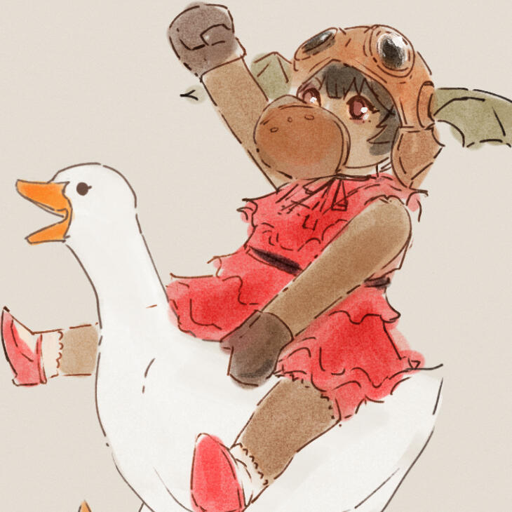 precisely three fulms tall and cute as a button, boombox’s tiny, preteen frame is several orders of magnitude smaller than her aura of pure, undistilled enthusiasm.a pair of gigantic, ruby red dunesfolk eyes peek out from beneath the hood of her leather gobbiemask. what little is visible of her face is smudged all over with unidentifiable workshop grime and shrouded by black bangs so choppy, one is led to suspect she must cut them herself.she is seldom seen without her feathered best friend, a pure white pet goose. the goose seems to be just as good at causing chaos as boombox herself. (it’s just a normal goose... right?)her voice is high and youthful, with a wild, childish giggle that somehow manages to be both adorable and deeply unsettling.